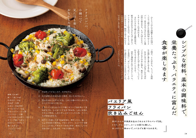 毎日、元気に楽しく過ごすには、適度な運動とともにおいしい食事が基本。シンプルな材料、基本の調味料だけでも栄養たっぷり、バラエティに富んだ食事が楽しめます。