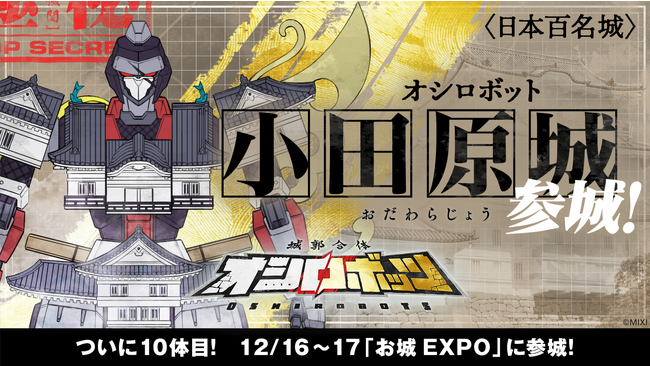 株式会社MIXI(東京都渋谷区、代表取締役社長 上級執行役員 CEO:木村 弘毅)は、MIXI_ANIMEオリジナルコンテンツ『城郭合体オシロボッツ』のオシロボット「小田原城」を本日公開しました。2023年12月16日(土)~17日(日)には、パシフィコ横浜で開催される「お城EXPO 2023」に出展し、オシロボット「小田原城」を含む計10体のオシロボットの物販やトレーディングカード配布、ARイベントを行います。