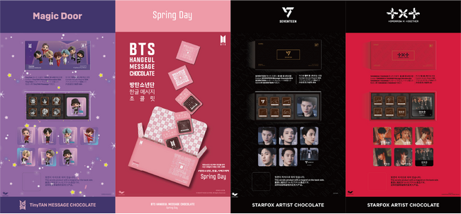 「STARFOX ARTIST CHOCOLATE」は、「BTS」のメンバーが可愛いキャラクターとなった「TinyTAN」(全6種)、韓国の人気アーティスト「SEVENTEEN」(全3種)、「TOMORROW X TOGETHER」(全2種)、「SUPER JUNIOR」(全2種)、「NCT DREAM」(全3種)、「NCT 127」(全4種)、「aespa」(全2種)のアクリルマグネット付きアーティストチョコレートと、「TinyTAN」(全2種)、「BTS HANGEUL MESSAGE CHOCOLATE」(全2種)のステッカー付きメッセージチョコレートの全26種がラインナップされている。