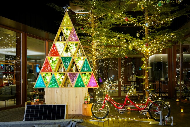 「居酒屋以上 旅未満 みんなでルーズに過ごすホテル」をコンセプトとする「星野リゾート BEB5軽井沢(ベブ)」で、2023年12月1日に、自転車をこげばこぐほど、イルミネーションが光る!「BEB サステナブルクリスマス」の点灯式を実施しました。サステナブルをテーマとしたクリスマスイベントの開催は、今年で3年目です。今年は初の試みとして、地元高校生の協力のもと、イルミネーションに使用する電力を太陽光や自転車の動力で発電する仕組みを開発。これにより、CO2をまったく排出しないクリスマスツリーが誕生しました。また、クリスマスツリーは間伐材やホテル運営で生じた資源をアップサイクルして制作しており、サステナブルにクリスマスを楽しむことができるイベントです。点灯式には発電システムを開発した高校生も参加し、当日訪れた参加者とともに、自転車をこいでクリスマスツリーやイルミネーションがキラキラと光る様子を楽しみました。