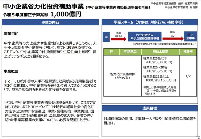 省力化投資補助金とは、2023年11月に閣議決定された補助金です。2024年度から開始予定となっており、AI・ロボットの導入により、中小企業の省人化・省力化の取組みに関する設備導入を支援します。令和5年度補正予算として1,000億円、総額5,000億円の補助事業です。