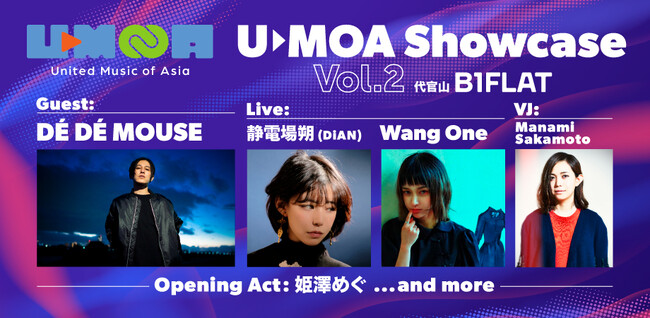 U/M/A/A Inc.は来たる12月15日(金)代官山「B1FLAT」にて、デビュー間近のエレクトロニック・ポップ・ユニット「Wang One」と中国のマルチ・クリエイター「静電場朔 (DiAN)」、そしてゲストに「DE DE MOUSE」をフィーチャーしたショーケース・イベント「U≫MOA Showcase vol.2」を開催いたします。DE DE MOUSEは自身のアジア・アーティストとのコラボ楽曲と、そのセンスでセレクトしたシティ・ポップや自身の曲をリエディットした”DE DE MOUSE Asian Disco Mix”のスペシャル・セットを披露予定。そしてオープニングアクトには現役大学生シンガー「姫澤めぐ」が登場。今年10月に恋愛リアリティ番組の出演で話題となり、日本と中国にルーツを持つ彼女がnote nativeプロデュース楽曲でその歌声を初披露!