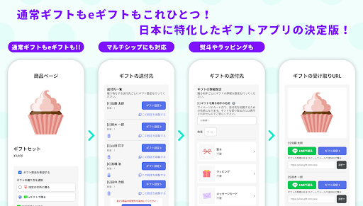 通常ギフトはもちろん、eギフトにも対応、熨斗やラッピングのオプション、複数配送(マルチシップ)、カタログギフトにも対応したギフトアプリの決定版です。 ギフトを通じて顧客との新しい出会いをつくることができ、購入率のアップにつながります。