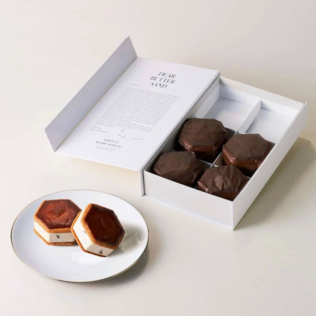 DEAR BUTTER SANDは、川手寛康シェフがバターサンドが幼い頃から“好き”なスイーツであると同時に、シェフの中で “感動する” レベルに達するまでのバターサンドにはまだ出会っておらず「まだ伸び代があるのでは?」と感じたところから開発が始まりました。約半年かけてようやく完成したバターサンド。1℃単位で味が変わるバターの味を何度も温度を変えて辿り着いた最高の焦がしバターはコクがあり、全体としてフランス料理らしい複雑味によって高級感が生まれ、皆さんのまだ知らない“感動”を味わえる新しいバターサンドになっています。