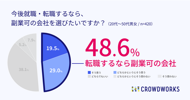 20代~50代男女のうち、48.6%が「今後就職・転職するなら、副業可の会社を選びたい」と回答