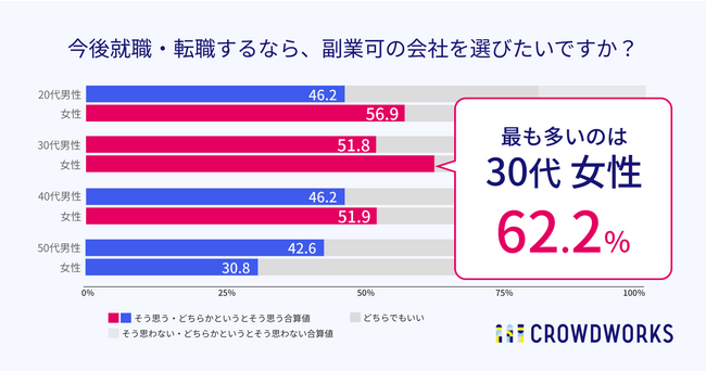 ~クラウドワークス「転職時の副業意向調査」から~ 30代女性がもっとも高く62.2%