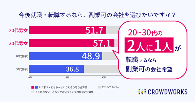 企業と個人をつなぐオンライン人材マッチングプラットフォームを開発・運営する株式会社クラウドワークス(本社:東京都渋谷区 代表取締役社長 兼 CEO:吉田 浩一郎 以下「当社」)は、本業を持つ全国の20代~50代の男女を対象に、「転職時の副業意向調査」を実施いたしました。その結果、各世代を合わせた全体のうち48.6%以上の人が「転職するなら副業可の会社」と回答、20代では51.7%、30代では57.1%と、若年層ほどその値が高く、30代でもっとも副業意欲が高まることが判りました。