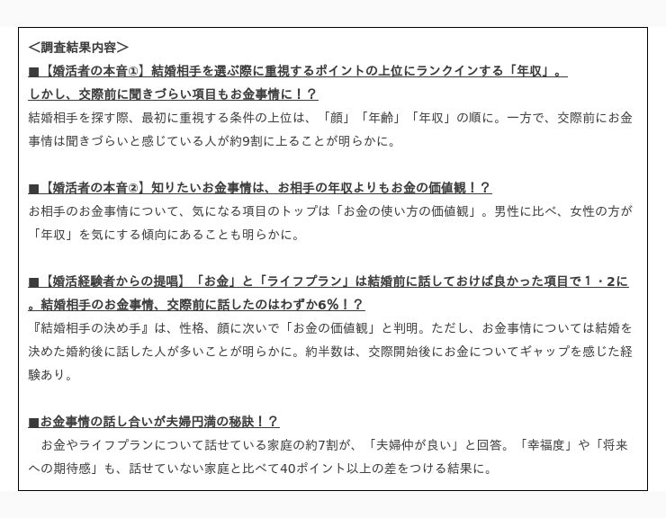 全国の20~40代の婚活中の男女300名(以下、婚活者)と、婚活を経て結婚をした男女300名(以下、婚活経験者)・合計600名を対象に実施した<婚活とお金事情に関する実態調査>では、婚活者の約9割が「お金」のことを聞きづらいと感じており、婚活経験者も結婚前に「お金」や「ライフプラン」について話しておけばよかったと思っていることが判明しました。また、「お金」と「ライフプラン」について話せている方が夫婦仲が良く、幸福度や将来への期待値が高いという結果も出ています。