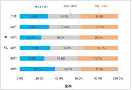 調査の結果、全体では「昨年よりも意識が高い人(※)」が訳4割弱(37.9%)を占めましたが、「昨年よりも意識が低い人(※)」も約3割(全体の28.8%)を占め、「昨年と同程度の人(※)」がちょうど3割(33.3%)と、免疫対策への意識は全年代を総合的にみると維持、ないしは向上している方が7割いることがわかりました。
