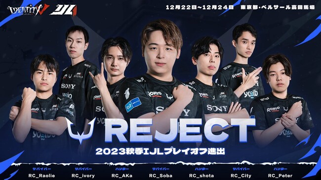 このたび、プロeスポーツチーム「REJECT」を運営する株式会社REJECT(本社:東京都文京区、代表取締役:甲山翔也、以下 REJECT)の第五人格部門が、12月22日(金)~12月24日(日)に行われる『2023秋季IdentityV Japan League Playoff』に出場することが決定いたしました。