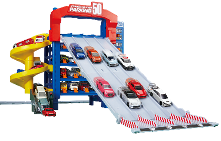 ロングスライダー付き5階建て立体駐車場です。最大50台のトミカでインパクト抜群の一斉走行が楽しめます。