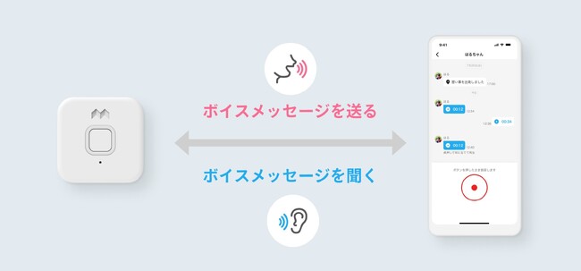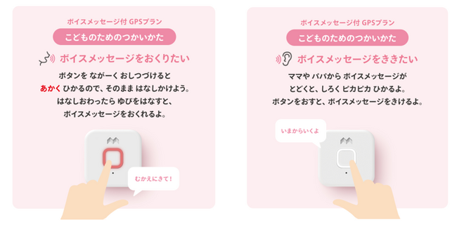 使い方は、小学校低学年の子どもでも簡単に操作できるシンプルなデザインです。GPS端末のボタンを長押しすることで、最大40秒の音声を録音して送信できます。保護者のスマホから新しい音声メッセージが届くとGPS端末のLEDが光り、ボタンを押せば古い音声メッセージから順々に再生され、音声メッセージを見逃さない仕様です。さらに、保護者はアプリから音声メッセージをGPS端末に送信・受信することができます。
