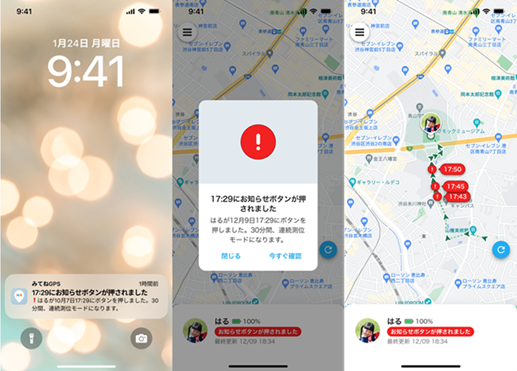 また、契約プランは音声メッセージを送受信できる「ボイスメッセージ付 GPSプラン」のほかに、「GPSプラン」も選択可能です。「GPSプラン」は「みてねみまもりGPS」の第3世代モデルで大好評の緊急時に子どもから保護者に通知できる「お知らせボタン」機能が利用できます。年齢ごとの活動範囲の広がりに合わせて契約プランおよび機能を変更するなど、子どもの成長に合わせた「みまもり」を提供します。