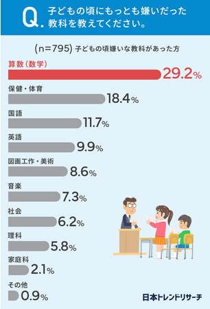 「子どもの頃に、もっとも好きだった教科」は「算数(数学)」が20.1%で1位に選ばれた一方で、「子どもの頃に、もっとも嫌いだった教科」でも「算数(数学)」が29.2%で1位でした。