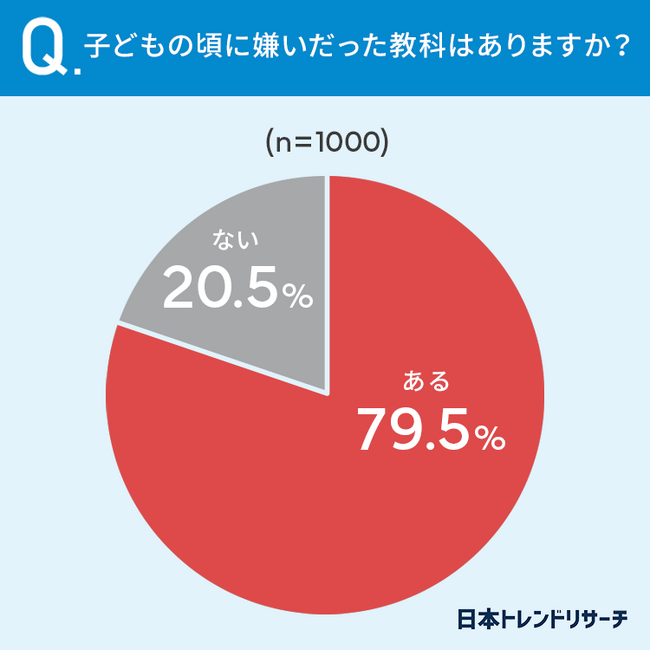 79.5%と、およそ5人中4人の方が「子どもの頃に嫌いだった教科があった」と回答しています。