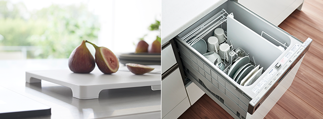 マグネットで浮かせて収納できる食洗機対応の抗菌まな板や、ラック下が拭けるお手入れが簡単なコンロ横ラックなど新商品発売