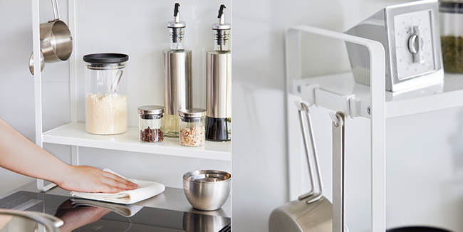 ラック下が拭けるのでお手入れが簡単なコンロ横ラック。