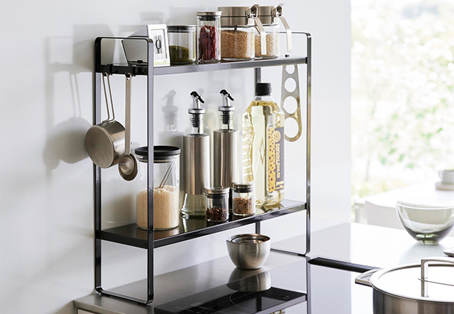 計量スプーンや背の高い調味料ケースなども収納できる2段棚の収納ラック。