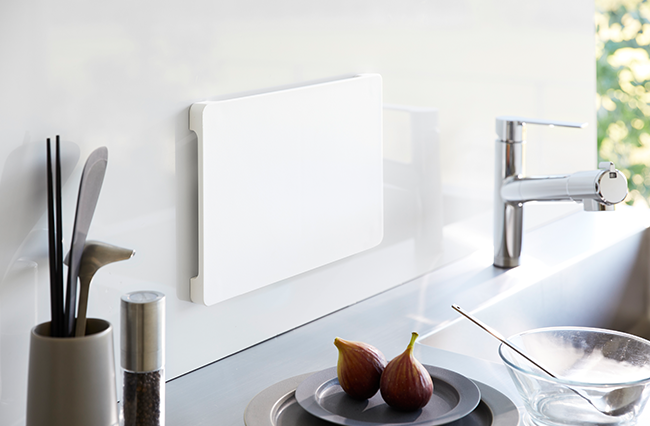 マグネットでキッチンパネルに浮かせて収納できる食洗機対応の抗菌まな板。