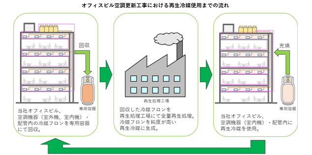 今回の取り組みは当社初の取り組みであり、今後のオフィスビル・商業施設における全ての空調機器更新において、再生冷媒を使用してまいります。