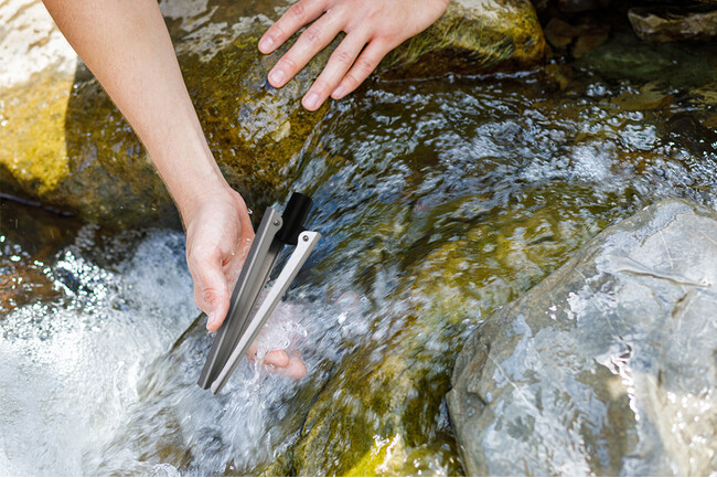 ホコリや汚れも気にする必要なく、泥がついても沢水で洗い流せる。まさに登山家のために設計された三脚です。