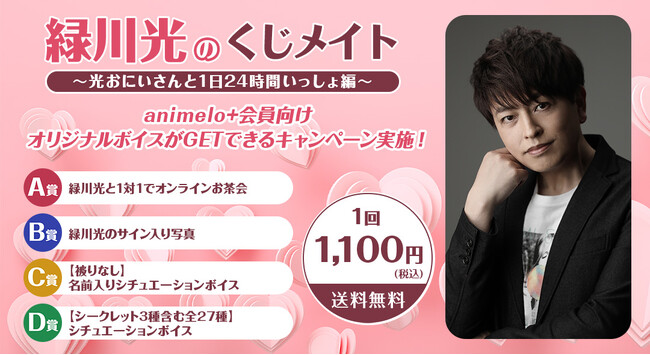 「緑川光のくじメイトVol.7~光おにいさんと1日24時間一緒編~」 は、緑川光の「くじメイト」シリーズの第7弾。景品は、A賞が「緑川光と1対1でオンラインお茶会」、B賞が「緑川光のサイン入り写真」、C賞が「【被りなし】名前入りシチュエーションボイス」、D賞が「シチュエーションボイス~光おにいさんと1日24時間一緒編~」の4種類です。