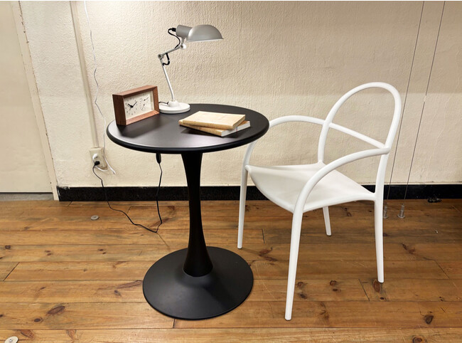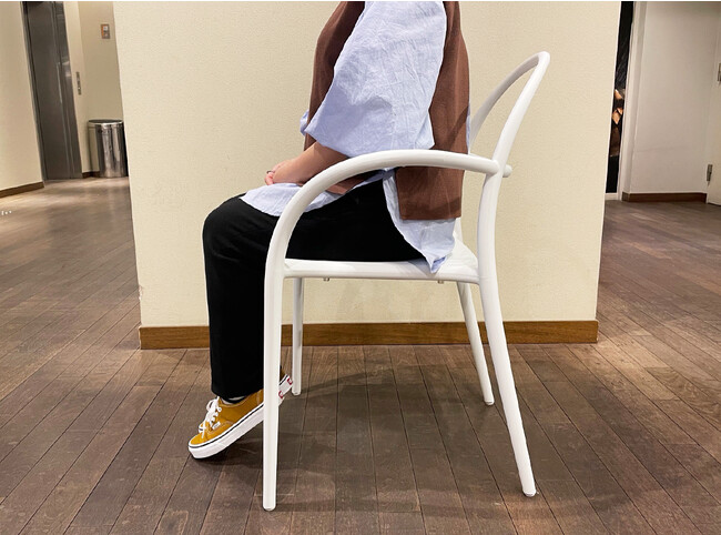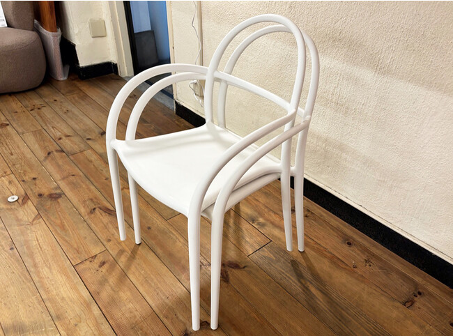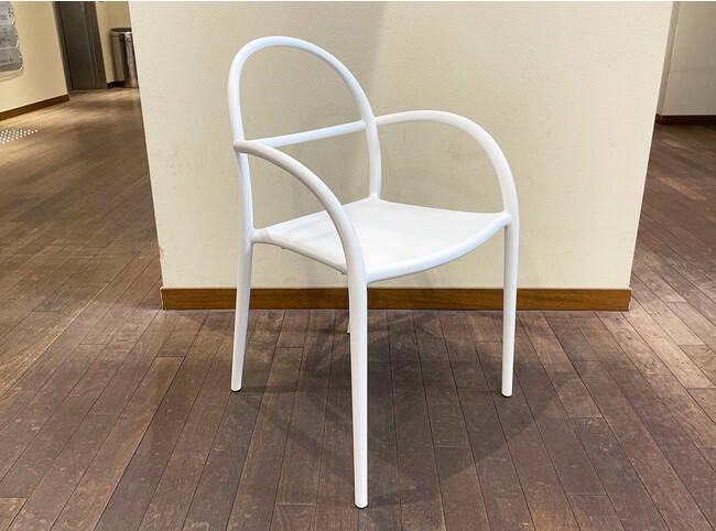 スケルトン構造は、空間を占める体積が小さくなるため、圧迫感を抑えられます。こちらのチェアは、線の細い曲線と白のカラーリングにより、一層繊細なイメージが強調されています。また、スタッキングできるので、使用しないときや空間を利用したいときに重ねて置くことができます。