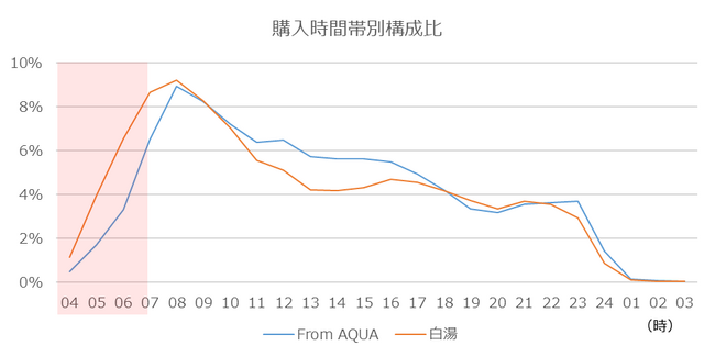 購入本数の時間帯別構成比率を見ると、「From AQUA 白湯」は朝4~6時の“早朝”時間帯の構成率がコールド商品と比べても高くなっています。白湯と言えば、朝起きた後に飲むものというイメージがありますが、エキナカでは、早朝時間帯に気温が低いということもあり、朝家を出た後に買うものとなっているようです。これまで、缶スープ商品で夕方から夜帯の需要を発掘したように、「From AQUA白湯」が“早朝”という新たな時間帯需要を発掘しています。