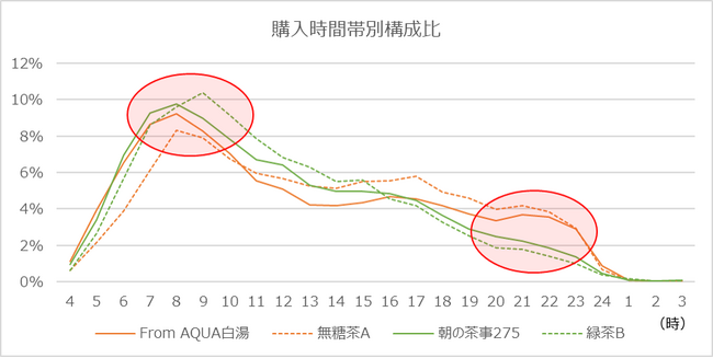 「From AQUA白湯」を含むノンカフェイン飲料(上記図のオレンジの線)と、カフェインを含んだ緑茶商品(緑の線)の購入時間帯を見比べると、朝は緑茶が強く、夜はノンカフェイン飲料が強い傾向にあることがわかりました。寝る前はカフェインを摂取しない、という方も多いですが、すでにその意識は帰り道のエキナカから始まっているようで、「From AQUA白湯」はカフェインレスを求める人にも好評のようです。