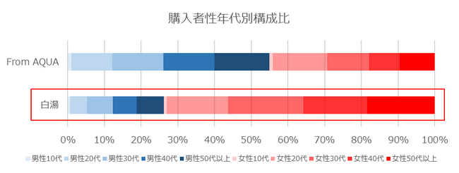 「From AQUA白湯」の購入者は、全体の7割強が女性という結果に。年代別では20代~50代以上が、ほぼ同じ比率になっています。