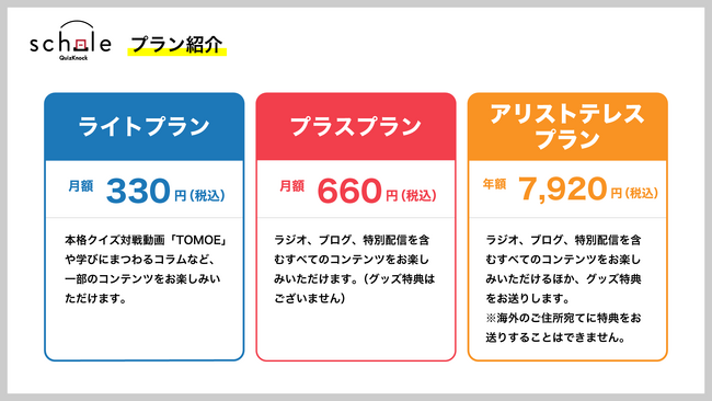 フォロワークラブ「QuizKnock schole」では、3つの料金プランをご用意しております。学びを求める人に向けた「ライトプラン」(月額支払いのみ)、メンバーによる限定公開ブログなどすべてのコンテンツを楽しめる「プラスプラン」(月額支払いのみ)、すべてのコンテンツに加えグッズ特典や会員番号がついてくる「アリストテレスプラン」(年額支払いのみ)のなかから、お好みのプランをお選びください。