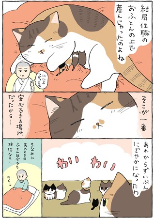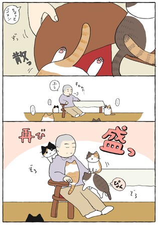ねこと住職というユニークな組み合わせから生まれるエピソードを40話+描き下ろし8ページ収録。