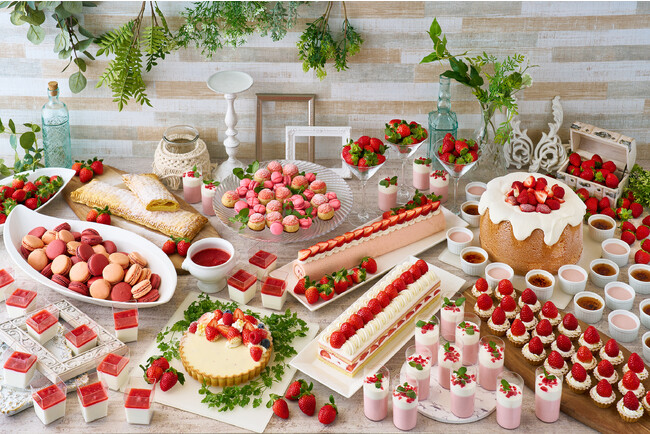 そのほか、ショートケーキやムース、タルトをはじめ、シフォンケーキ、ブリュレ、ロールケーキなど、苺のスイーツが勢揃いします。じっくりと時間をかけて焼き上げることで、ふわふわに膨らんだ特大サイズのスフレが好評の「焼きたてスフレ」は、期間中ピンク色の苺スフレをご提供します。この時季だけの苺メニューを存分にご堪能ください。