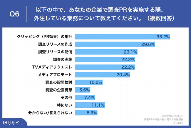 「Q6.以下の中で、あなたの企業で調査PRを実施する際、外注している業務について教えてください。(複数回答)」(n=108)と質問したところ、「クリッピング(PR効果)の集計」が35.2%、「調査リリースの作成」が29.6%、「調査リリースの配信」が23.1%という回答となりました。
