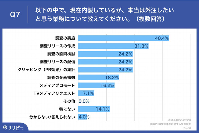 Q5で「特にない」「わからない/答えられない」以外を回答した方に、「Q7.以下の中で、現在内製しているが、本当は外注したいと思う業務について教えてください。(複数回答)」(n=99)と質問したところ、「調査の実施」が40.4%、「調査リリースの作成」が31.3%、「調査の設問検討」が24.2%という回答となりました。
