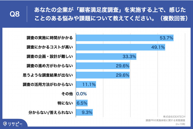 「Q8.あなたの企業が調査PRを実施する際、苦労していることや課題に感じていることがあれば教えてください。(複数回答)」(n=108)と質問したところ、「調査の実施に時間がかかる」が53.7%、「調査にかかるコストが高い」が49.1%、「調査の企画・設計が難しい」が33.3%という回答となりました。