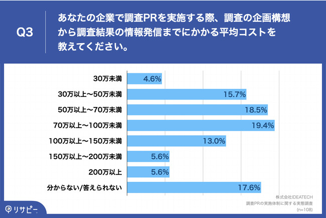 「Q3.あなたの企業で調査PRを実施する際、調査の企画構想から調査結果の情報発信までにかかる平均コストを教えてください。」(n=108)と質問したところ、「70万以上~100万未満」が19.4%、「50万以上~70万未満」が18.5%という回答となりました。