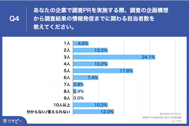 「Q4.あなたの企業で調査PRを実施する際、調査の企画構想から調査結果の情報発信までに関わる担当者数を教えてください。」(n=108)と質問したところ、「3人」が24.1%、「5人」が17.6%という回答となりました。