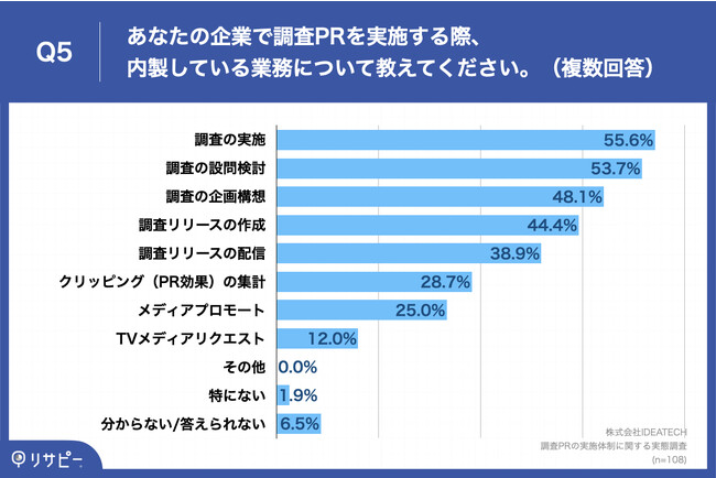 「Q5.あなたの企業で調査PRを実施する際、内製している業務について教えてください。(複数回答)」(n=108)と質問したところ、「調査の実施」が55.6%、「調査の設問検討」が53.7%、「調査の企画構想」が48.1%という回答となりました。