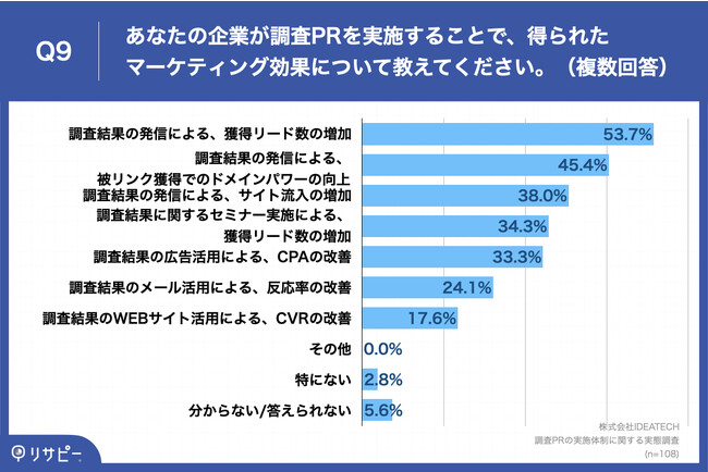 「Q9.あなたの企業が調査PRを実施することで、得られたマーケティング効果について教えてください。(複数回答)」(n=108)と質問したところ、「調査結果の発信による、獲得リード数の増加」が53.7%、「調査結果の発信による、被リンク獲得でのドメインパワーの向上」が45.4%、「調査結果の発信による、サイト流入の増加」が38.0%という回答となりました。