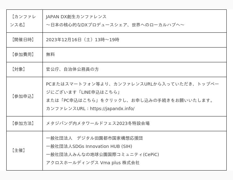 メタバースWeb3のコンテンツ企画・ディレクションを行うVma plus(ブイマプラス)株式会社(本社:東京都品川区、代表:津田徹)は、2023年12月に開催されるメタバースの冬の祭典「メタ・ワールドフェス2023冬」の最終日12月16日の13時~19時に「JAPAN DX創生カンファレンス」を開催することを発表いたします。