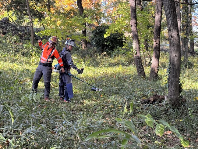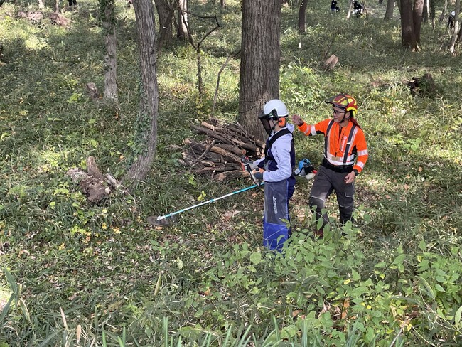実地体験では、鎌を使った下草刈りや、電動の刈払い機の操作を行いました。サンダくんも草刈りを体験し、参加者たちと共同で作業しました。 するどい刃が高速回転する刈払い機は、キックバックといって障害物に衝突すると反動で大きく跳ね上がることがあり一歩間違えると大けがに繋がりかねないため、慎重な作業と集中力が不可欠です。