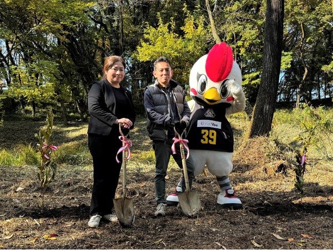 講義で日本の森林への基礎知識や森林保全に携わることの重要さを学んだ後、今回は三井住友銀行様からご寄贈いただいた「クヌギの木」の植樹を実施しました。その植樹式では、参加者を代表して三井住友銀行北村光人部長と当社ブランドコミュニケーション部長の西村依希子、並びに群馬クレインサンダーズ公式マスコットのサンダくんが参加しました。