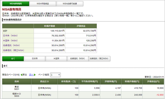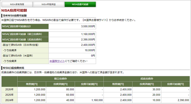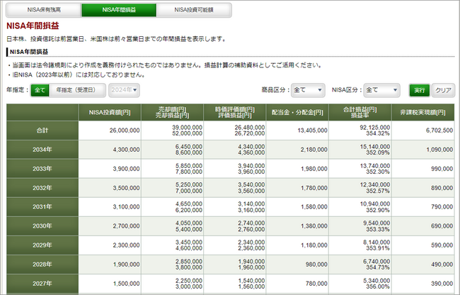 新NISAで取り扱う全商品の残高や損益が一覧で確認できる画面を導入予定です。NISA口座全体の年間損益や、商品ごとの年間損益が一画面完結で確認でき、成長投資枠とつみたて投資枠の年別の利用状況などをわかりやすく表示できます。