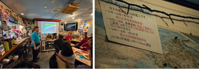 そんな篠原さんは33次南極観測隊に参加・帰国後、豪華客船の飛鳥・飛鳥IIに合計14年も乗船し、料理人として活躍されました。そして「やっぱりもう1度オーロラが見たい。」となんと50次隊に再び参加されます。その後は現在のお店を開店し、今年で14年目になるそうです。横浜で料理人をしながらも南極で学んだことを伝えずにはいられず全国各地に招かれて講演活動をされています。頂戴した名刺の裏には「世界1周×9回、南極越冬隊×2回、世界70ヵ国約200都市を巡り世界9周7大陸と7つの海に足跡を残す」と言う文字がありました(他にもたくさんの経歴が書かれています)。