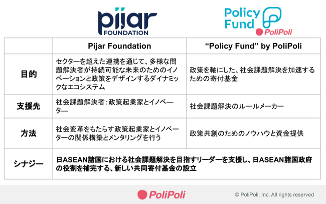 PoliPoliの、政策を軸にした社会課題解決のための寄付基金「Policy Fund」と、Pijar財団がインドネシアに有する社会課題解決事業者のプラットフォームを連携させ、新しい共同寄付基金の設立を目的としています。