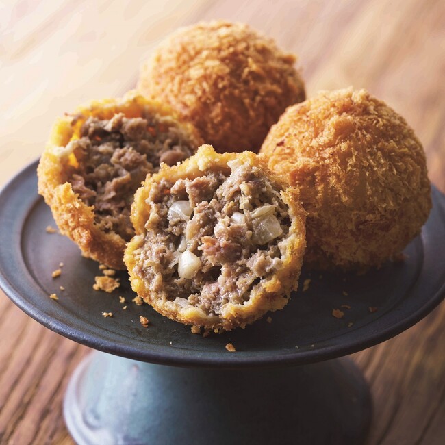 吉祥寺で行列のできるやみつきメンチ。まん丸でサクサクの衣の中からジューシーな肉汁があふれ出す。