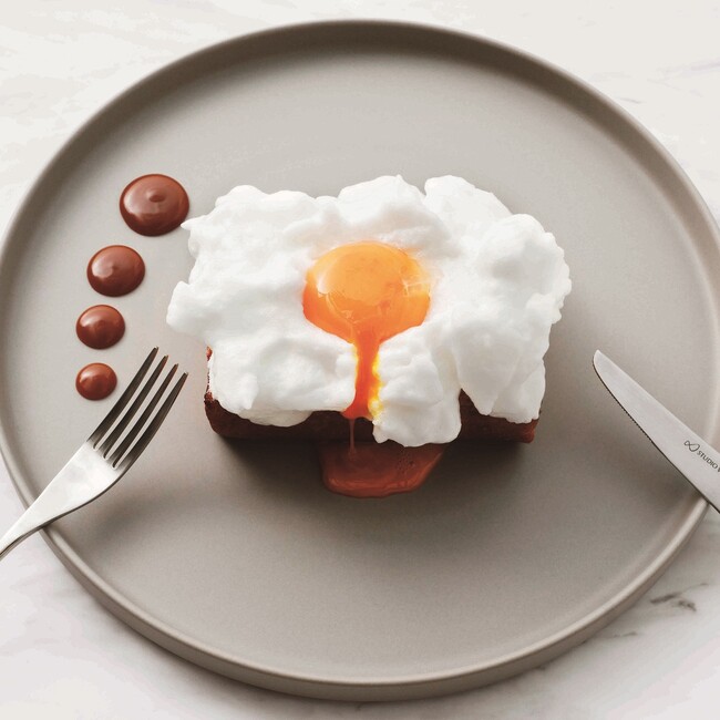 メレンゲをのせたフレンチトーストは、プディングのようなふわふわの仕上がり。焦がしキャラメルソースでどうぞ。