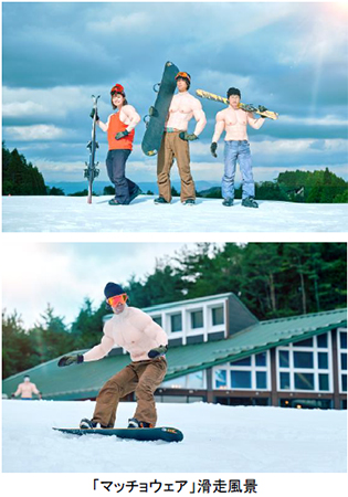 物理的にも精神的にも「胸をアツくする」ために独自開発した、着れば誰でもマッチョになれる筋肉型のウェアが登場。着用してゲレンデを滑走する姿は季節感を忘れるほどアツい光景が広がります。
