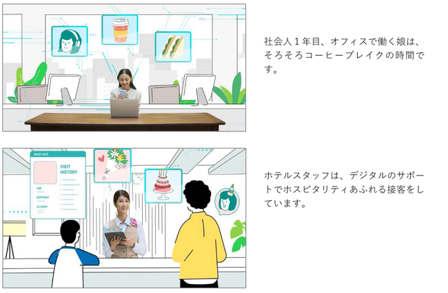 本ムービーは、まさに私たちがDXの取り組みを通じて実現していく「ありたい姿」を映像で表現したものです。映像の限られた時間の中では、そのすべてを表現することはできませんが、具体性を重視し、特定のシーンを抽出して、当社グループの強みを活かした価値創出やお客さま目線での体験価値向上のようすが視覚的に伝わるように描きました。